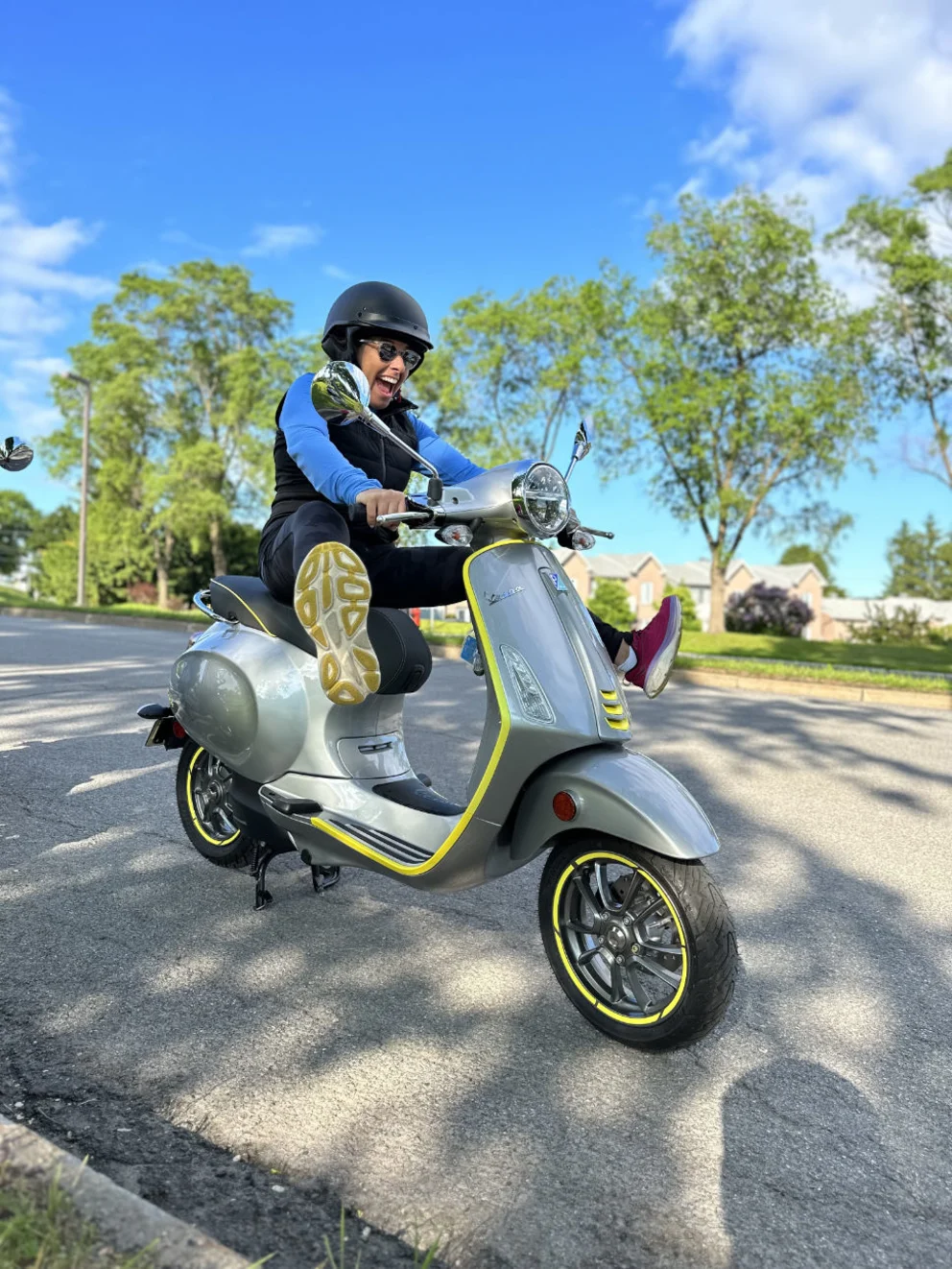 Nous les avons tout de suite trouvé légers et intuitifs, et les rétroviseurs nous offraient une bonne visibilité. Nous nous sommes tout de suite senties en confiance. Bonus : la Vespa électrique offre un silence de roulement exceptionnel ! (Pas comme sa conductrice)